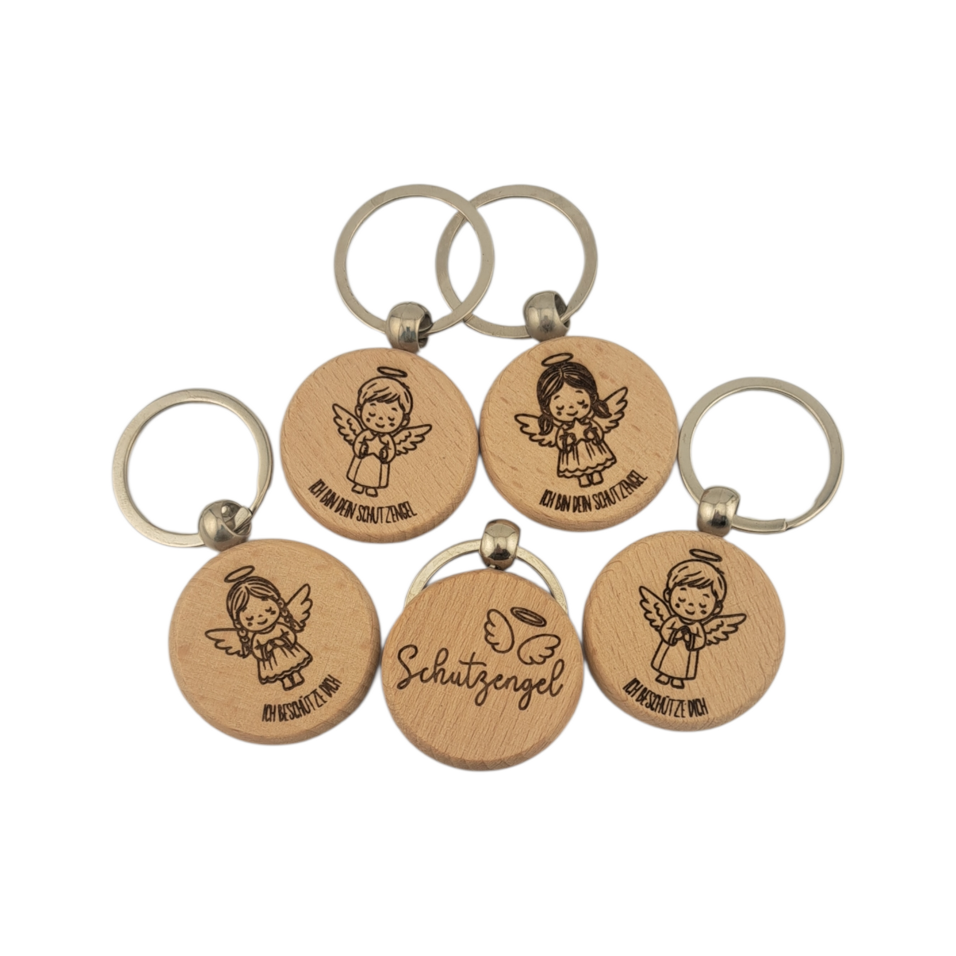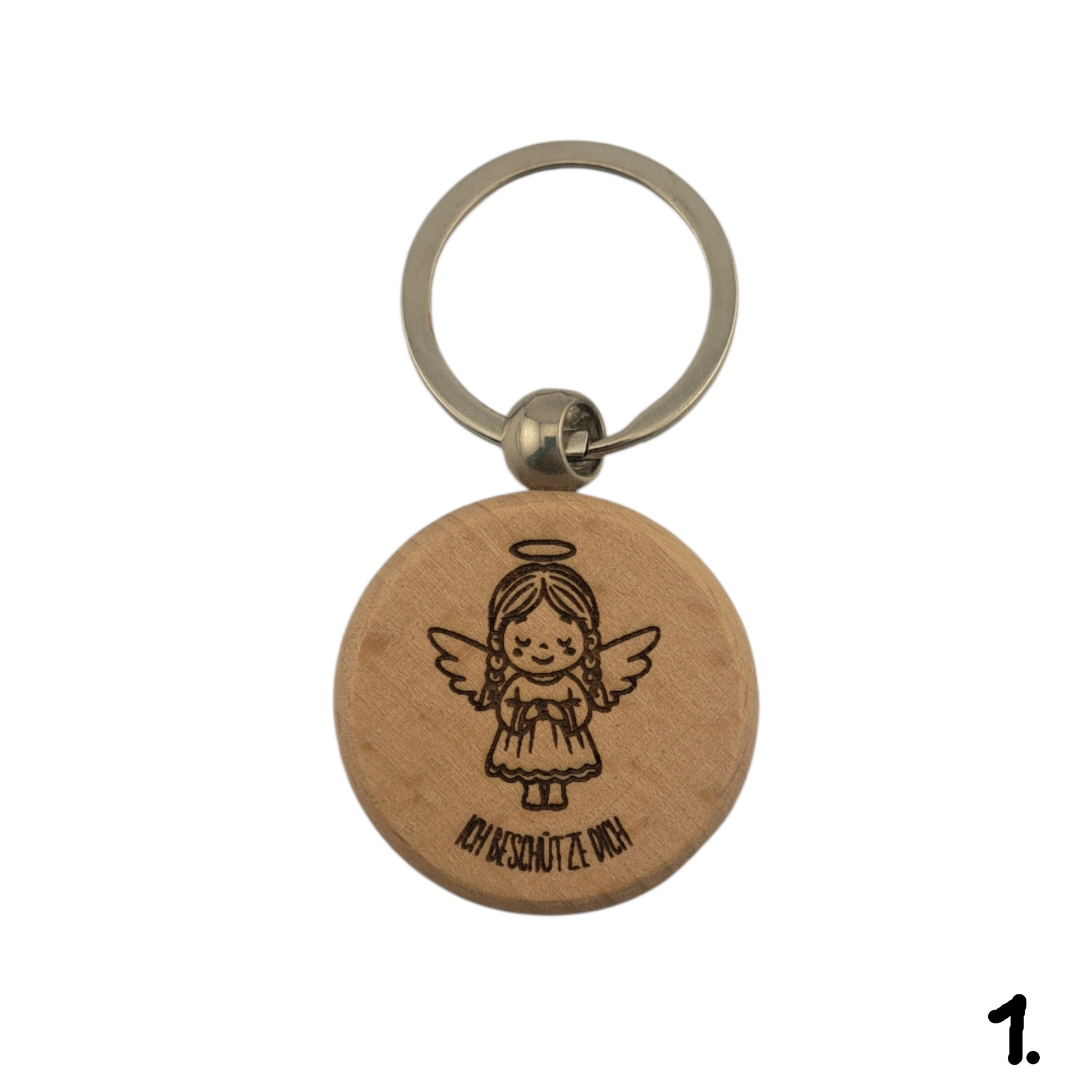Schöne Schlüsselanhänger aus Buchenholz mit Metall Schlüsselring. Lasergraviert mit verschiedenen Mustern und Aufschriften.