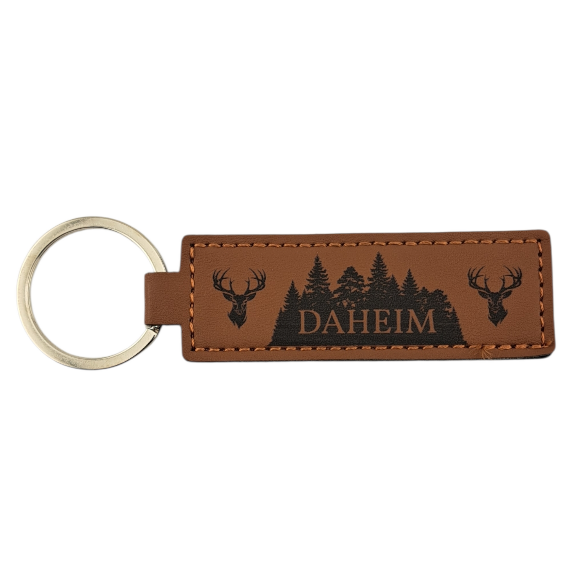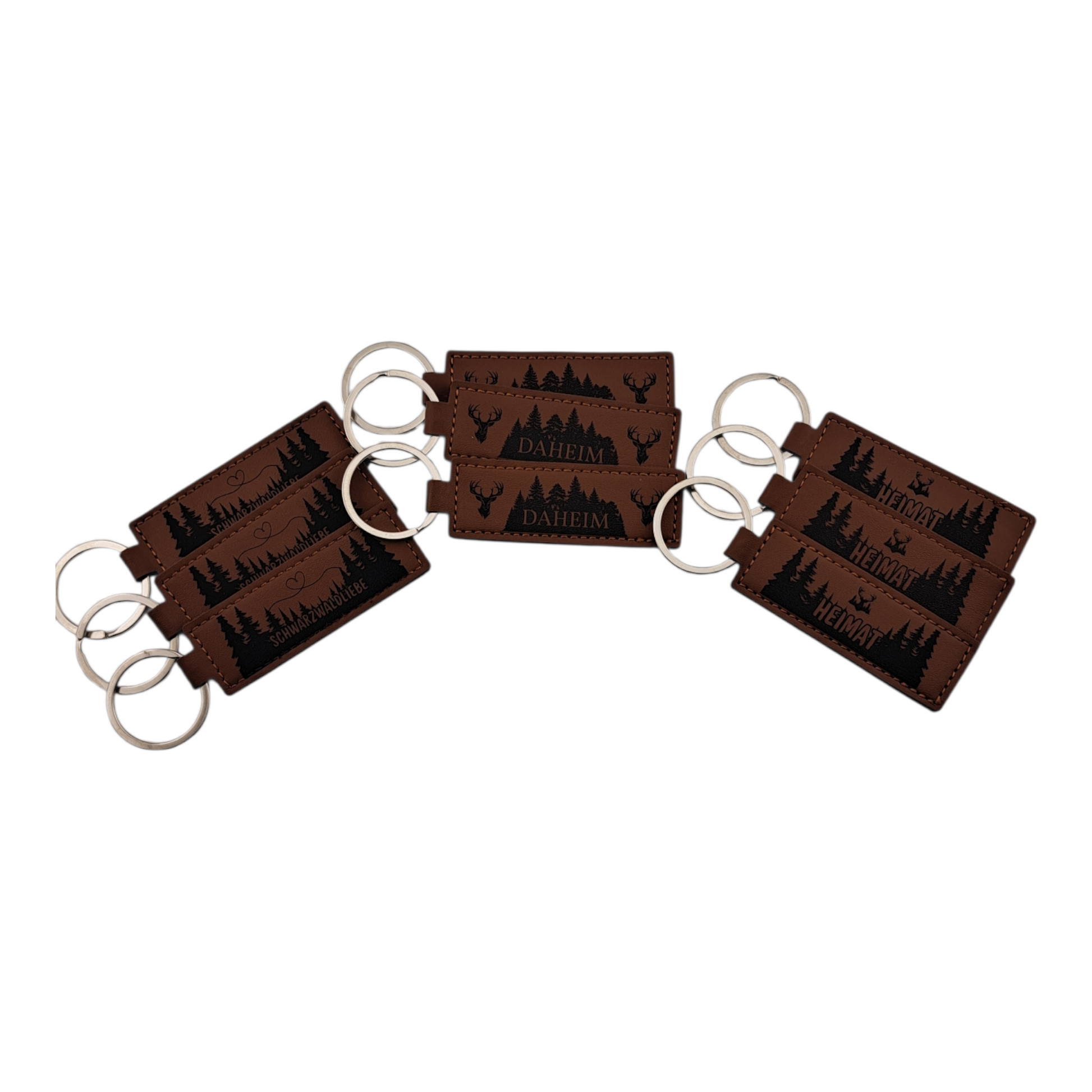 Schöne Schlüsselanhänger in brauner Lederoptik. Lasergraviert mit verschiedenen Mustern und Aufschriften.